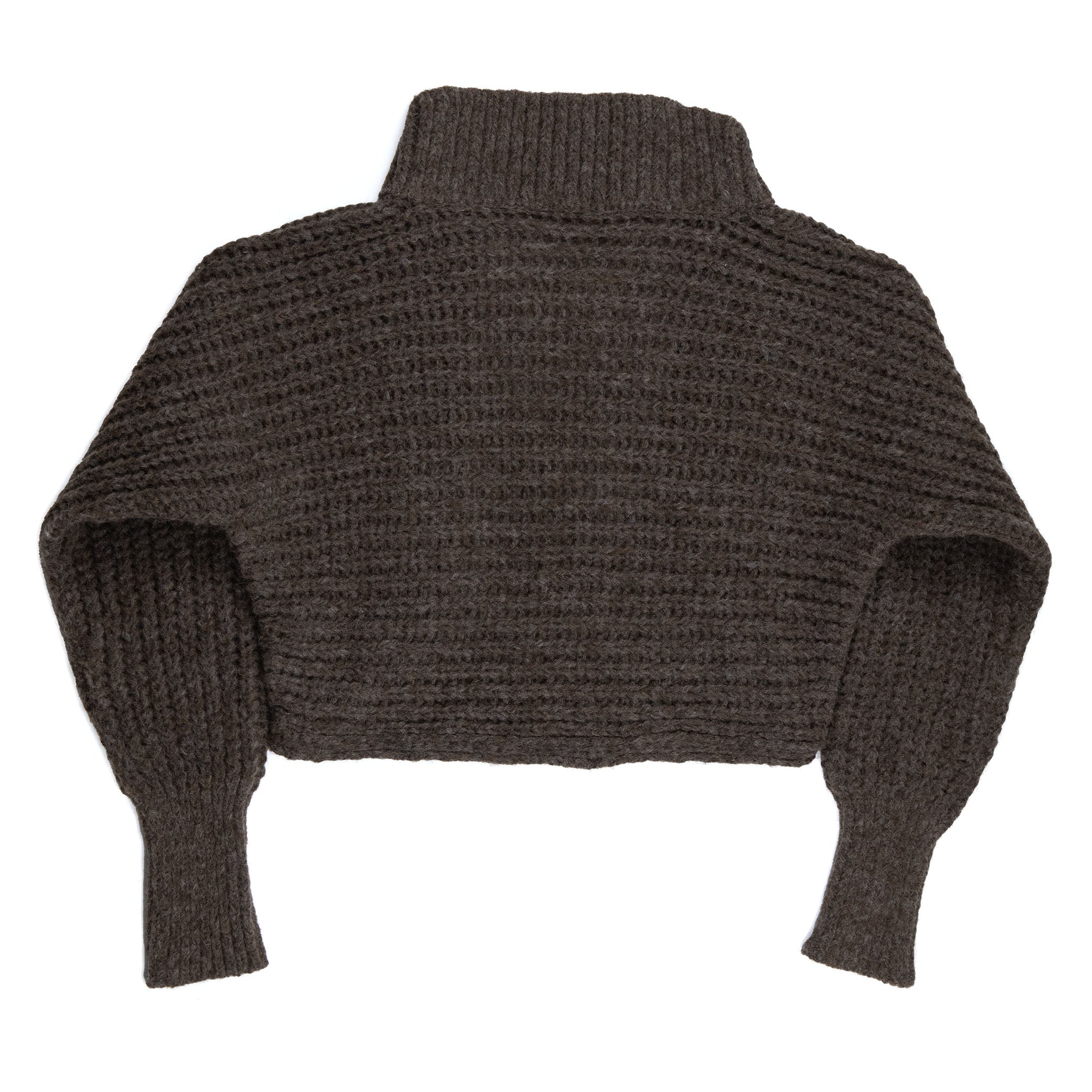 Alpaka Strickjacke mit Kragen, die vorne geöffnet ist und sich vielseitig kombinieren lässt. Braun als Alpaka Naturfarbe, ohne chemische Färbung. Kuschelige Grobstrick Optik für weiche Wärme und höchsten Tragekomfort.