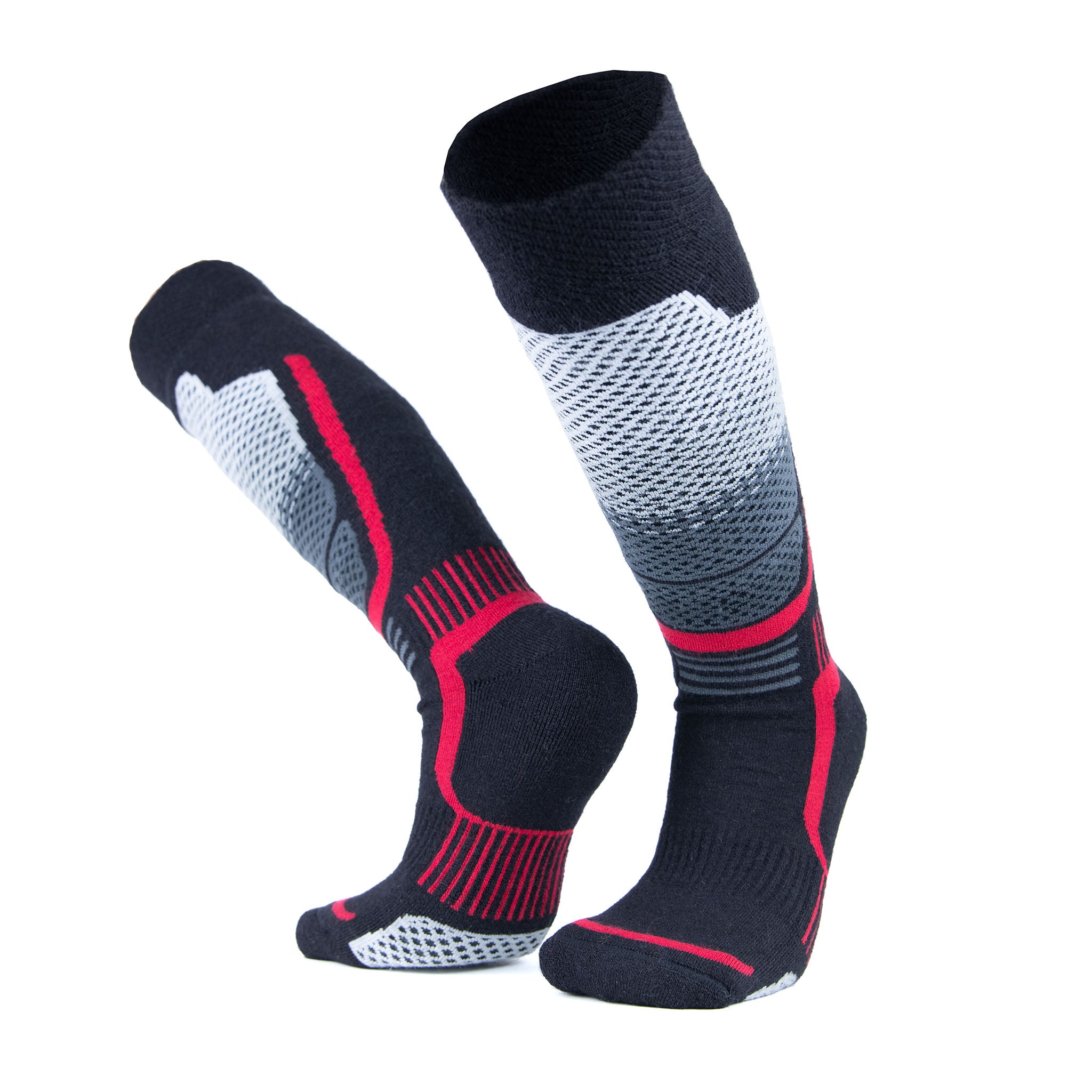 Extra robuste Skisocken aus Alpakawolle von Alpakin in schwarz, rot und grau mit sportlicher Musterung
